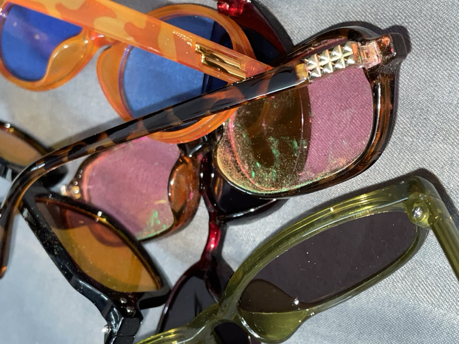 The image displays a close-up, static arrangement of multiple pairs of sunglasses, piled haphazardly on a textured, light gray fabric surface. The scene does not depict any identifiable location within Rishikesh, India, or any outdoor or urban environment. Specific objects include: * One pair with translucent olive-green frames and dark lenses, positioned prominently on the left. * Another pair with dark brown frames and orange-tinted lenses, visible towards the upper left. * A pair with tortoise-shell frames and reddish-purple lenses, showing scattered green and gold particulate residue on its surface. The temple of this pair is visible, adorned with a row of small, square, metallic studs. * A pair with bright orange, possibly camouflaged, frames and blue lenses, extending from the right side. * Other partial frames and lenses are visible underneath, including elements of dark red and dark brown frames with pinkish lenses. No people are present. No actions or interactions are occurring beyond the static resting of the objects on the fabric surface. The lighting appears to be even, without harsh shadows.