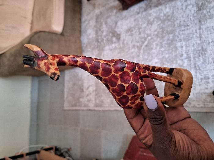 - "A dark-skinned hand with light purple nail polish holds a wooden giraffe figurine, approximately 8 inches tall, upright" by FM-UrRWw2, licensed under CC BY 4.0