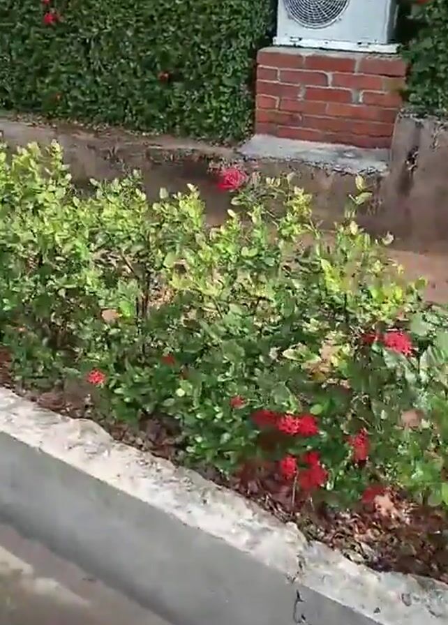 The camera slowly pans along a concrete planter bed filled with small, green bushes dotted with bright red flowers. Behind the planter, a tall, thick green hedge extends upward. To the left, an air conditioning unit sits atop a small brick base, nestled against the hedge. The ground is visible beneath the hedge and is partially covered with mulch.
