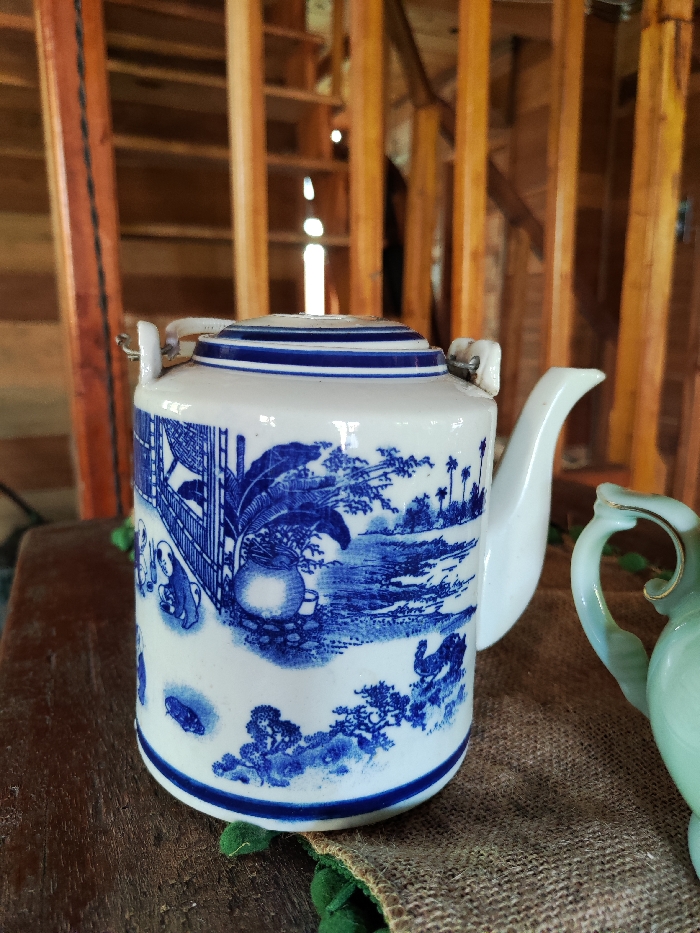 The scene is located in the city of Lán Tranh, Vietnam. In the foreground, a white ceramic teapot with a blue transferware design dominates the center. The teapot is cylindrical with a ribbed lid, a curved white spout extending to the right, and two small white protrusions on its upper rim, likely for a handle attachment. The blue decoration depicts a detailed landscape scene featuring a lattice-like architectural structure on the left with figures, a large potted plant, a body of water, various trees including palm trees, and what appears to be a bird-like figure in the lower right. To the right and slightly behind the teapot, a partial view of a pale green, opaque pitcher or creamer with a curved handle accented with a gold-colored trim is visible. Both objects rest on a brown, woven fabric, likely burlap, which has a distinct green, possibly fringed or pompom-like, trim along its visible edge in the foreground. This fabric lies on a dark, unidentifiable flat surface, possibly wood. The background is out of focus, showing a blurred wooden structural framework composed of vertical and horizontal beams or slats, suggesting an indoor or sheltered wooden structure. Bright light penetrates from the background through gaps in the wooden structure. No people or overt actions are discernible.