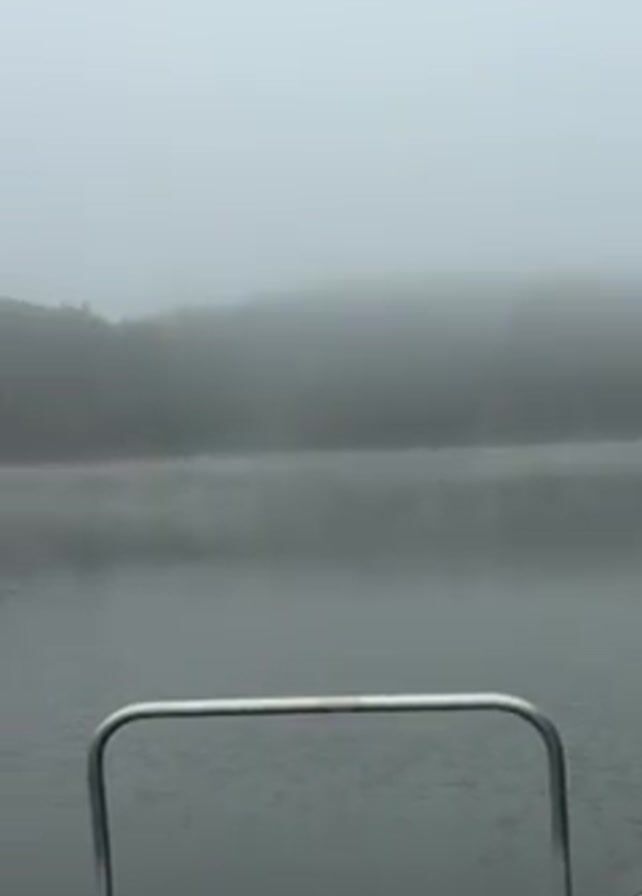 view of a lake on a foggy day, taken from a dock. The water is calm and gray, and the fog obscures the view of the trees lining the opposite shore. The dock has wooden railings and a metal handrail. The fog is thick, making it difficult to see anything beyond the immediate shoreline. The overall tone of the video is peaceful and serene.
