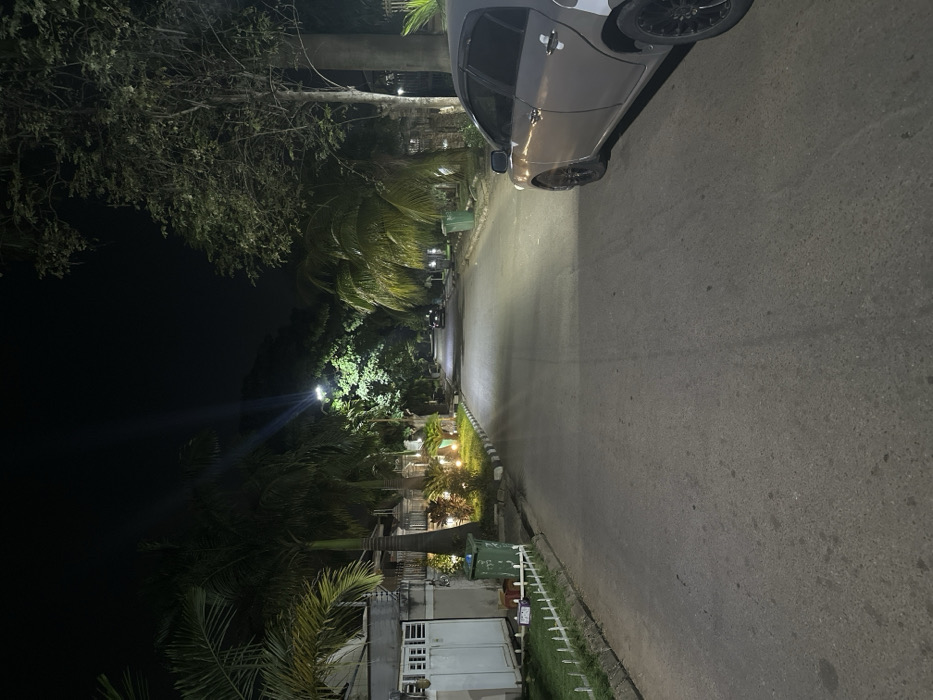 A nighttime scene featuring a gray car parked on a street. The road is illuminated by streetlights and car headlights. Palm trees and other greenery line the sides of the street, casting shadows. Some buildings and structures are visible. The overall atmosphere is dark with bright points of light.