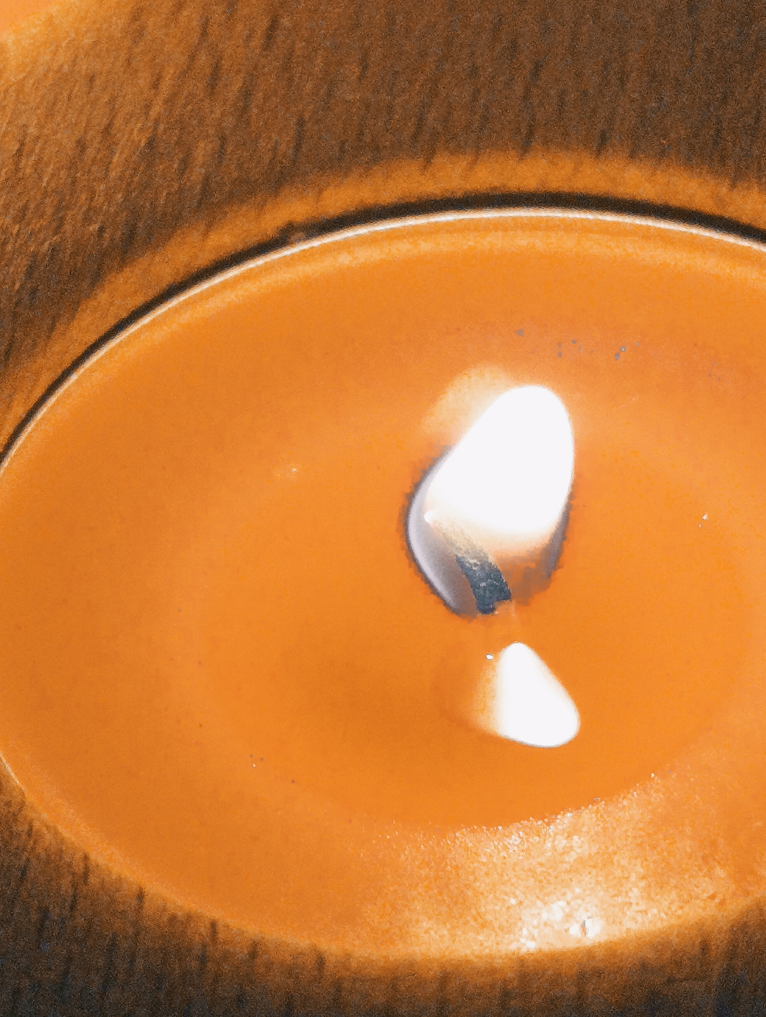 A close-up, high-angle shot focuses on a lit candle. The candle is set in a circular container with a visible rim. The wax pool is orange and reflects the flame in two distinct areas. The flame itself is bright white with a dark wick visible within it. The container surrounding the candle appears to have a textured, brown surface. The background details are blurred due to the close proximity of the camera.