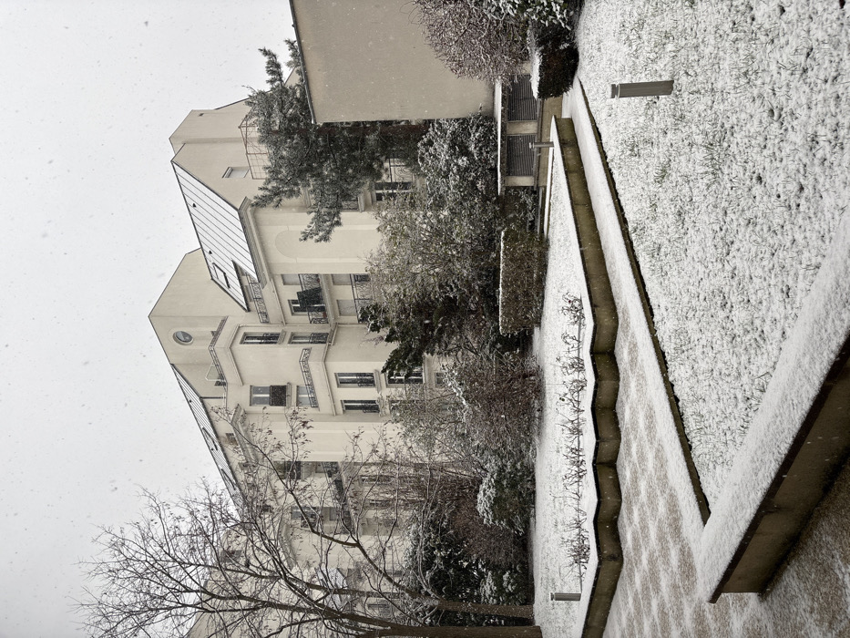 The image depicts a snow-covered residential courtyard in Boulogne-Billancourt, France, under an overcast sky with active snowfall