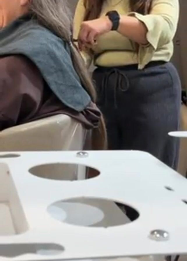 - "In a beauty salon, a person with long, gray hair is sitting in a salon chair, covered in a brown gown and a blue towel" by FM-CYJaF3, licensed under CC BY 4.0
