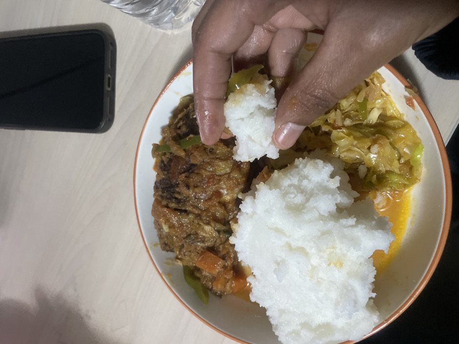- "A close-up image depicts a dark-skinned human hand holding a portion of white, granular food" by FM-k4z3A2, licensed under CC BY 4.0