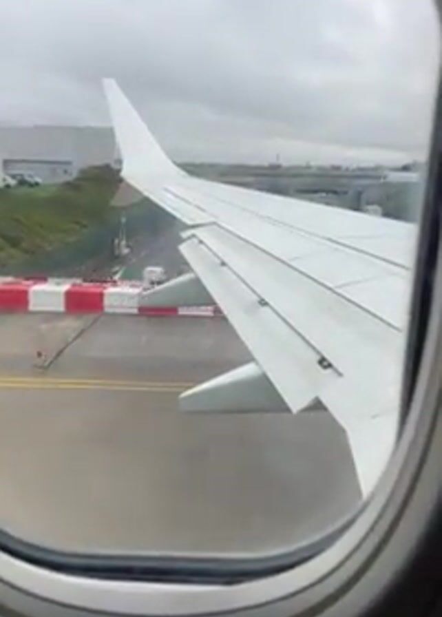 The view from inside an airplane window shows the white wing of the plane and a runway that it is taxiing on