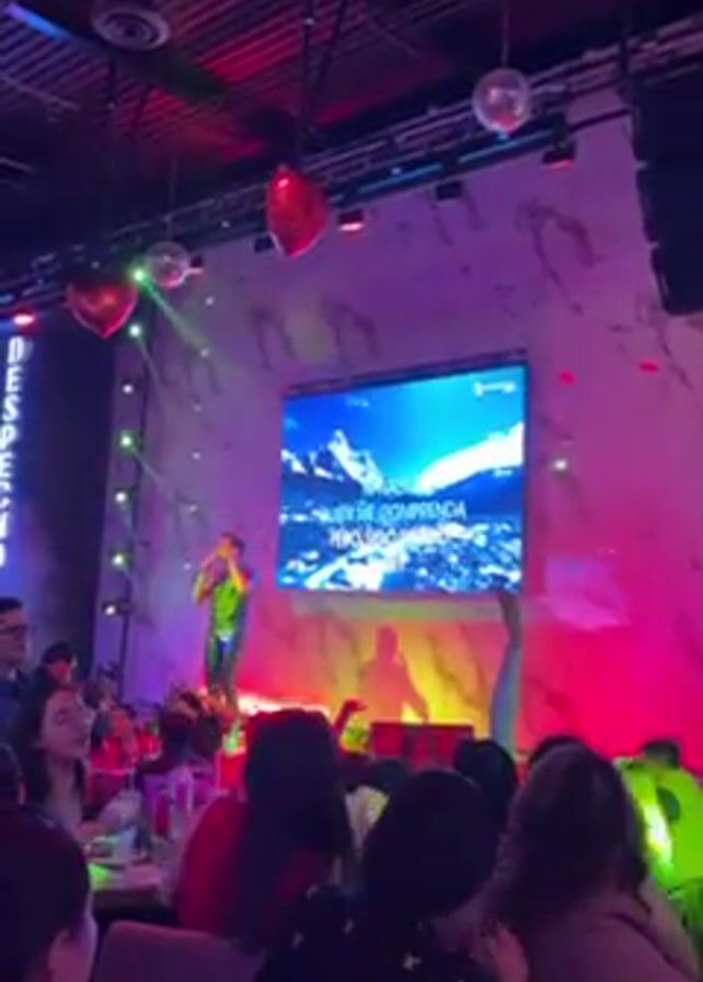 man singing on stage in front of a crowd in a club or restaurant. The club is decorated with heart-shaped balloons and disco balls. The stage has a large screen displaying lyrics and a mountain landscape. The audience sits at tables, some people are filming or raising their hands. The lighting is colorful, shifting between red, pink and blue. The word "Despecho" is written vertically in lights.