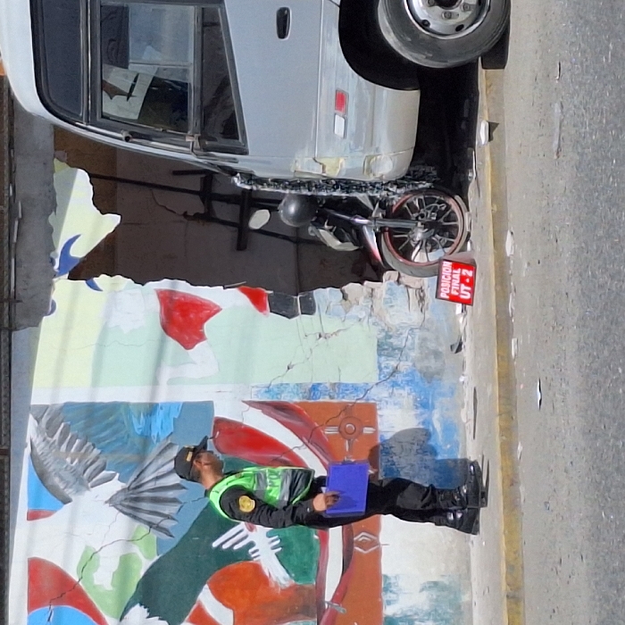 The scene depicts the aftermath of an incident in Mariano Melgar, Peru, captured during daylight hours. A male police officer, wearing a dark uniform, reflective green vest with "POLICIA" visible, and a dark cap, stands on a concrete sidewalk. He holds a blue folder or clipboard and appears to be observing the area to his right. To his right, a light grey small bus or large van is positioned parallel to a brightly painted wall. A black and red motorcycle is wedged between the front-right section of the van and the wall. The wall, adorned with a mural depicting a bird with outstretched wings and abstract shapes in red, blue, green, and white, exhibits significant structural damage and a large opening where the vehicles are situated. Cracks are visible across the painted surface of the wall. On the sidewalk in front of the motorcycle, a red-framed marker with white text reading "POSICION FINAL UT-2" indicates a point of interest for documentation. Scattered debris, possibly paper or light material, is visible on the asphalt road and the edge of the sidewalk. The large vehicle's right side appears to have some cosmetic damage or a missing panel near where it contacts the motorcycle.