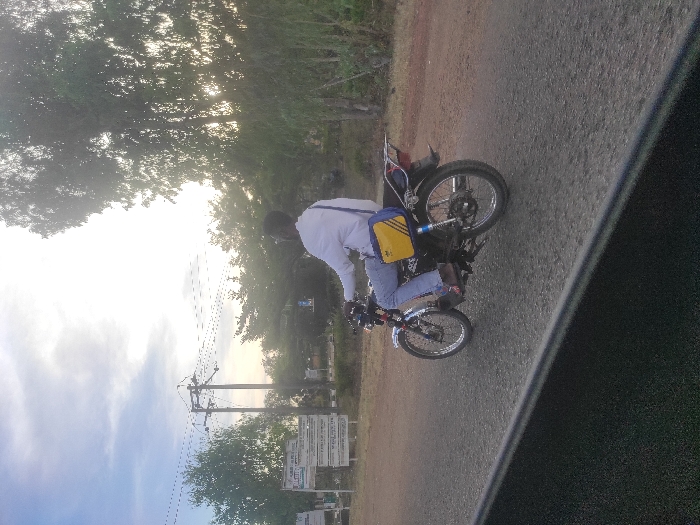 A man wearing a white shirt and jeans rides a motorcycle on a paved road. He carries a yellow and blue bag over his shoulder. The background includes trees, power lines, and a sky with sunlight peeking through clouds. The photograph appears to be taken from inside a vehicle, as part of the car’s window is visible in the frame.