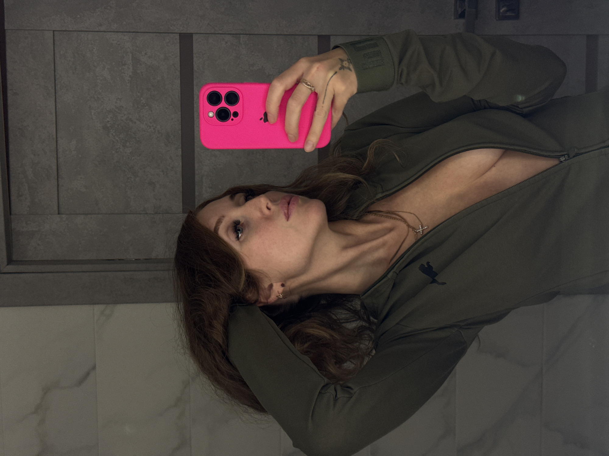 A woman takes a selfie in front of a grey and white tiled wall. She's holding a bright pink phone. She has long, wavy brown hair and is wearing a zippered, olive green Puma sweatshirt, unzipped to expose some cleavage. She's wearing a necklace with a cross and a ring on her finger. A small tattoo is visible on her hand.