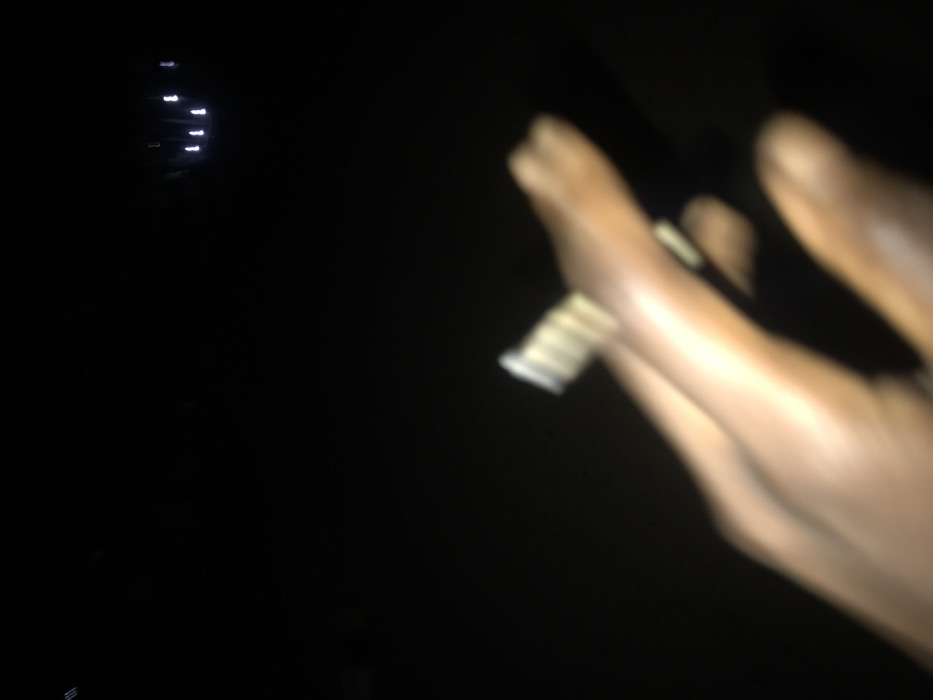 The scene depicts a human hand holding a rolled item in Galadimawa, Nigeria, under conditions of extreme low light, likely nighttime