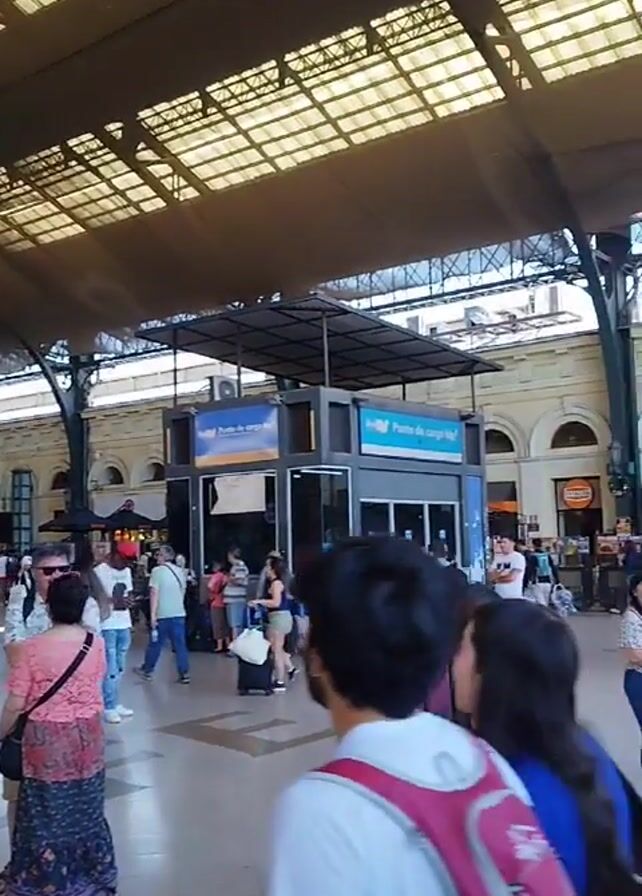 n indoor train station. A high ceiling has steel supports and a semi-transparent roof. Many people are walking in various directions, some with luggage. There is a small structure in the center, labeled "Punto de carga lia". A tall Christmas tree stands to the right, decorated with lights and colorful ornaments. The overall atmosphere is busy, indicating a public transportation hub.