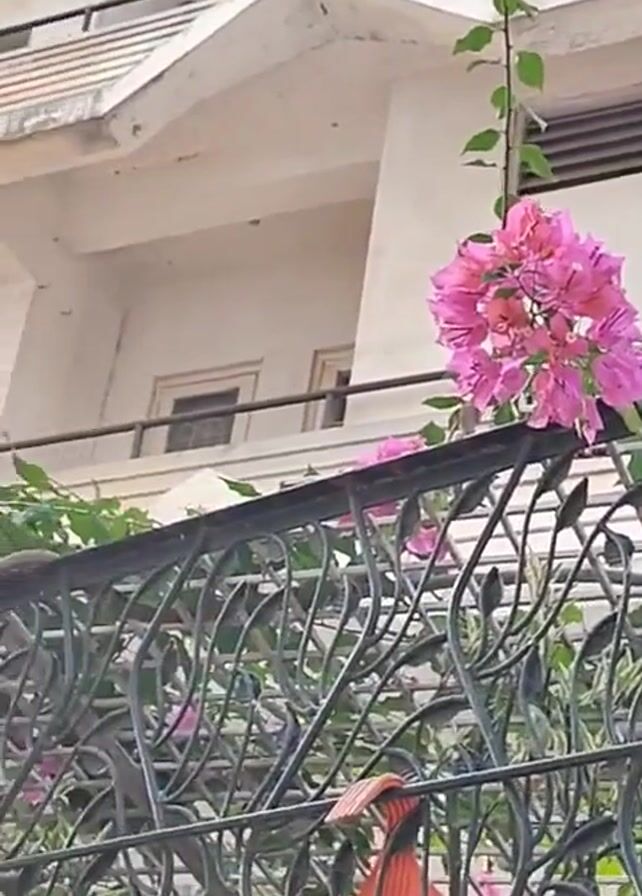 bougainvillea plant with pink flowers growing over a black metal fence in front of a white building. The building has multiple windows and a white roof. The camera slowly pans up the fence to reveal more of the building.