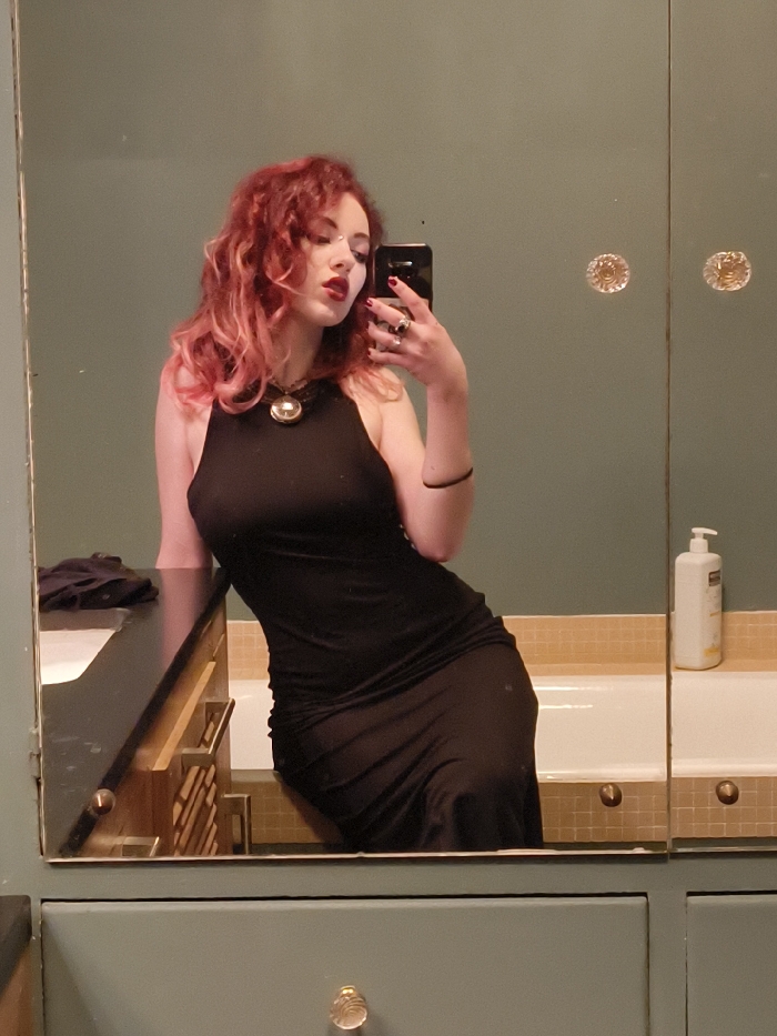 A person with shoulder-length red wavy hair poses for a mirror selfie in a bathroom. She is wearing a sleeveless black dress and a statement necklace. The bathroom features muted green walls, a white bathtub, and a sink with wood cabinetry. The mirror reflects details of the room, including drawer pulls and a bottle of lotion on the edge of the tub.