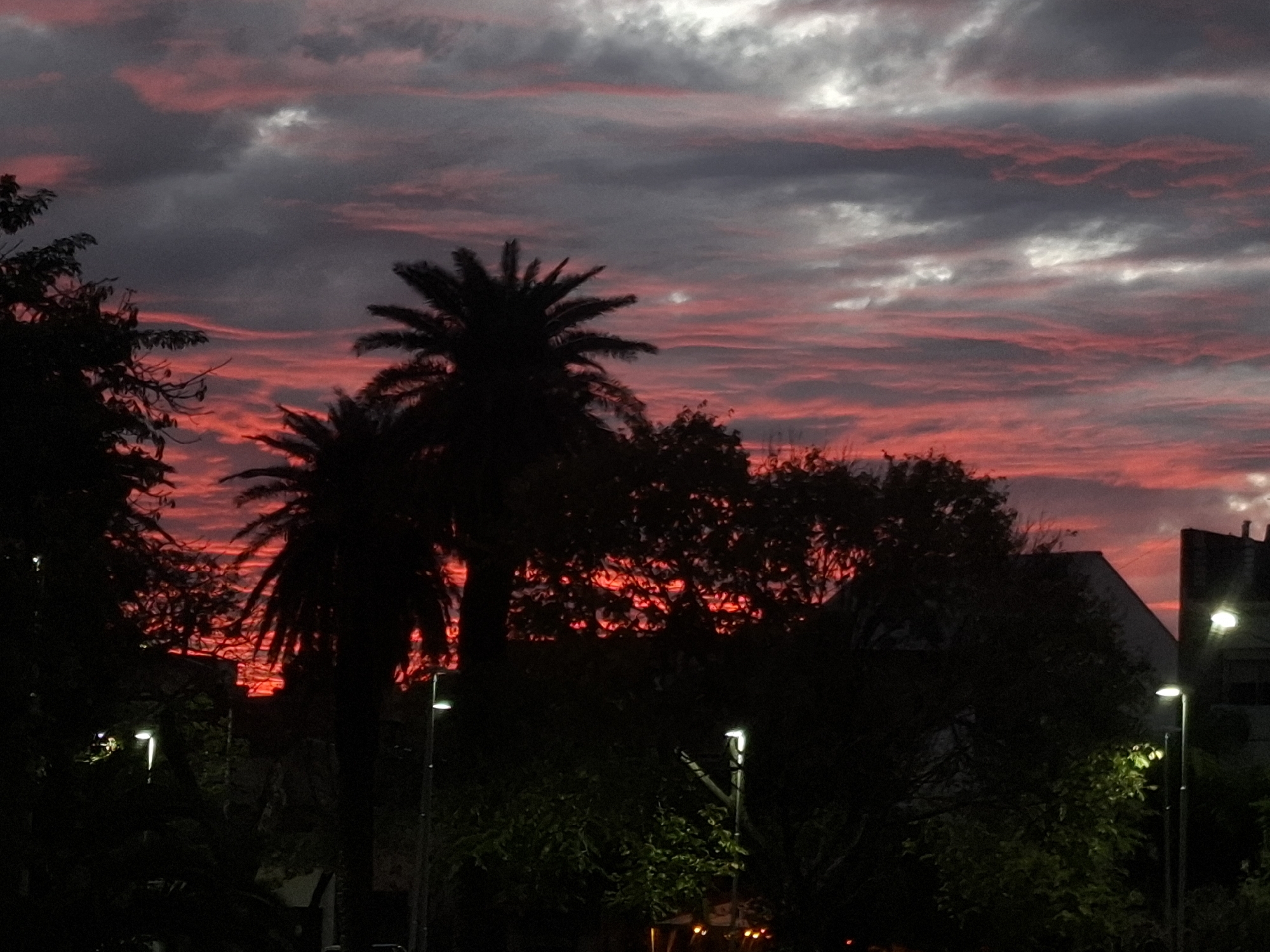 An outdoor scene captured at dusk in Villa Domínico, Argentina, features a dramatic sunset sky with prominent layers of altostratus clouds displaying intense red and pink coloration across the lower and middle portions, contrasting with darker grey and white clouds in the upper sky. In the foreground and mid-ground, a dense silhouette of trees dominates the lower half of the frame. Two large palm trees are centrally located, with their dark fronds sharply defined against the illuminated sky. Various other dark, undefined tree canopies occupy the left and central-lower areas. Artificial illumination is present from three activated streetlights: one on the far left, one slightly right of the center, and one on the far right, each emitting a bright white-green light. In the background, on the right side, two building silhouettes are partially visible through the foliage, appearing as dark, angular structures. No individuals or specific actions are discernible within the frame.