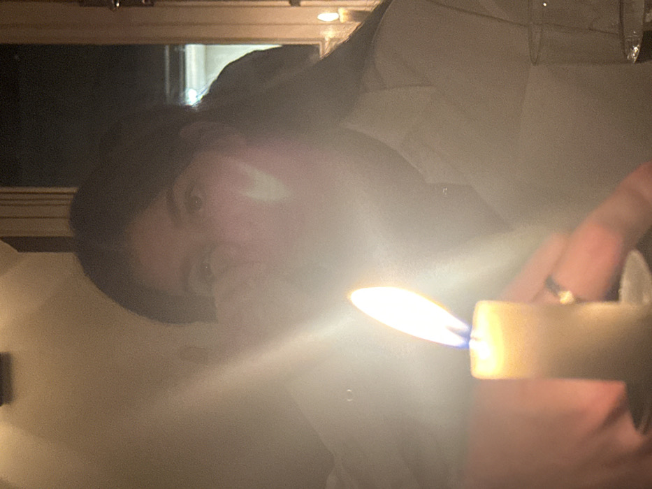 A person with dark hair is captured partially in a close-up shot, softly illuminated. They appear to be holding a lit candle close to the camera, the flame causing a bright glare. The background includes what seems to be a wall and a framed reflection. The person's facial features are slightly blurred by the light, creating an intimate, warm ambiance.