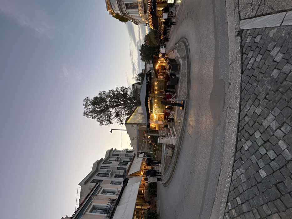 An outdoor restaurant glows with lights, partially covered by a translucent structure. People dine at tables, and lush greenery peeks from the sides. The street curves around the space, transitioning from pavement to cobblestone. Buildings line the road, some adorned with awnings. A tall tree stands nearby, its branches reaching towards the evening sky. The scene is peaceful and inviting.