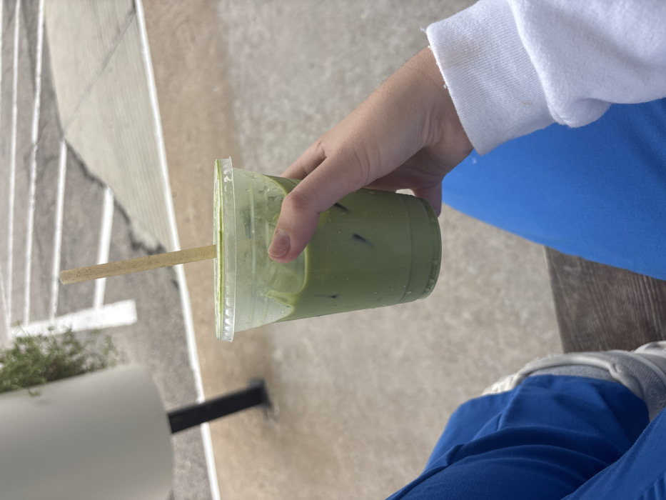 A first-person perspective image depicts an individual seated outdoors on a dark wooden bench, holding a beverage. A fair-skinned left hand grasps a clear plastic cup filled with an iced green liquid, consistent with matcha, and containing a light brown straw. Condensation is visible on the cup's exterior. The person wears royal blue trousers or sweatpants, with a white sweatshirt cuff visible on the right wrist and a portion of a grey and white sneaker visible on the left foot. The background features light grey concrete pavement with faded white markings, suggesting a street or parking lot. A tall, light-colored cylindrical object with a dark base, possibly an urban fixture, is partially visible on the left, alongside blurred green foliage. The scene is consistent with an urban or commercial outdoor setting in Houston, United States; a precise location within the city is not identifiable from the visual information.