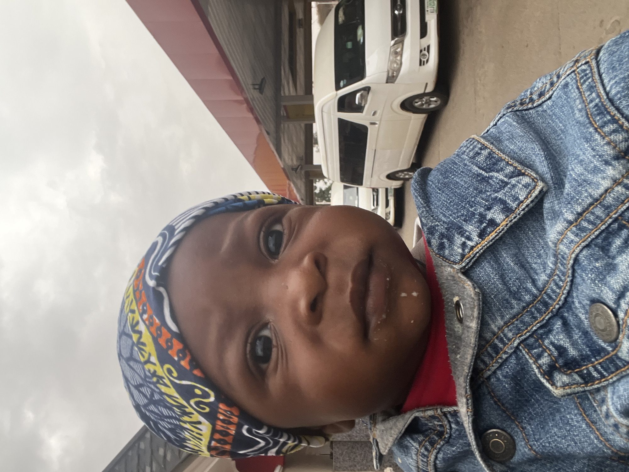 A close-up shot depicts a baby wearing a blue, yellow, and red patterned head covering and a denim jacket. The baby has dark skin and appears to have recently eaten, with some white residue around their mouth. In the blurred background, there are white passenger vans and a building. The image was likely taken at a station or roadside in Jos, Nigeria.