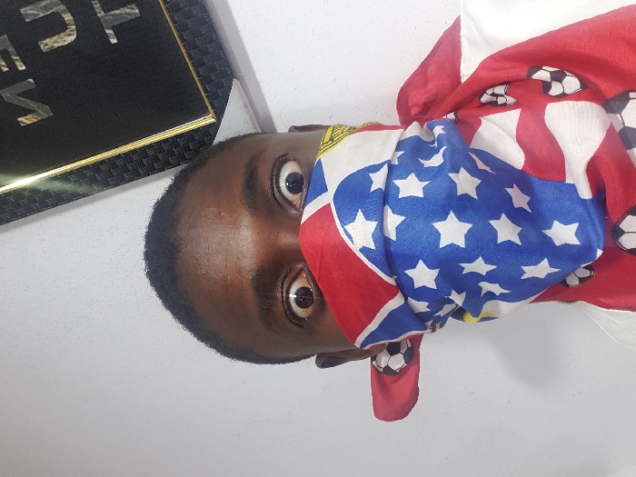 A person is angled to the left, their face covered by a fabric patterned with stars and stripes, similar to an American flag. The fabric also features soccer ball designs. The person's eyes are wide and expressive. To the left, a framed plaque with indiscernible writing is visible. The background appears to be a plain white wall.