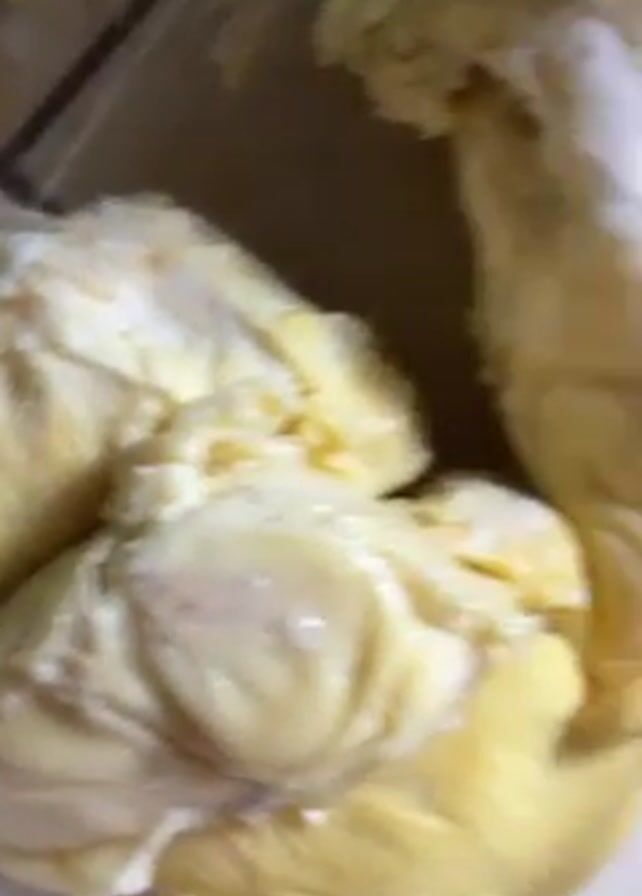 clear plastic container holding several chunks of durian fruit. The durian pieces are pale yellow with a slightly creamy texture. Some pieces have a whitish area on them. The container appears to be on a tiled surface. A voice can be heard speaking in the background.