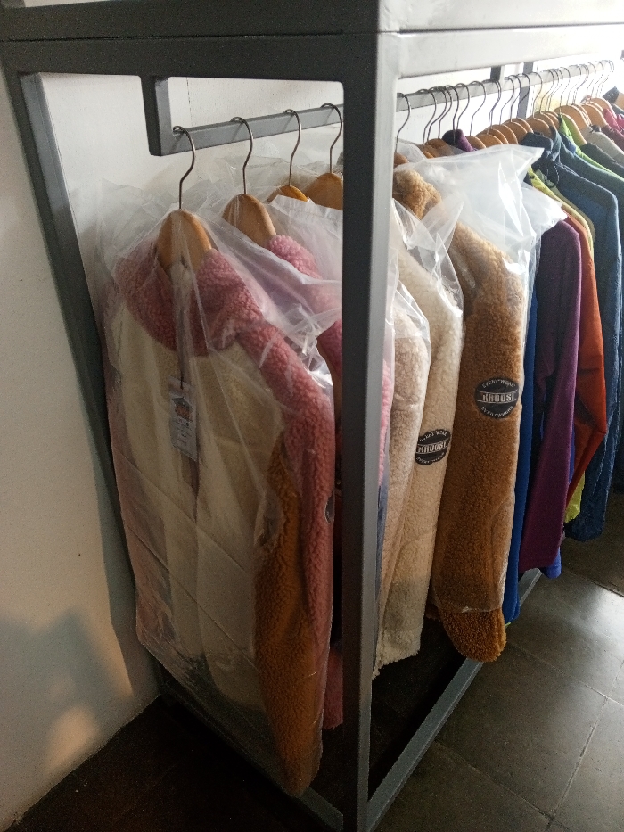 The image captures a segment of a clothing display rack located in Baza, Myanmar (Burma). A dark grey, rectangular metal frame supports a horizontal bar from which multiple garments are suspended on wooden hangers. The visible clothing consists primarily of jackets, many appearing to be fleece or sherpa material, encased individually in clear plastic garment bags. Colors of these jackets include cream, beige, reddish-pink, and various shades of brown. One brown jacket prominently features a circular "KHOOST" brand sticker visible through its plastic covering. Further along the rack, additional garments in various colors such as blue, purple, and green are visible, though less distinctly. The background features a plain white wall, and the floor is composed of dark grey or brown tiles with discernible grout lines. No individuals are present in the scene, and no specific actions or interactions are depicted.