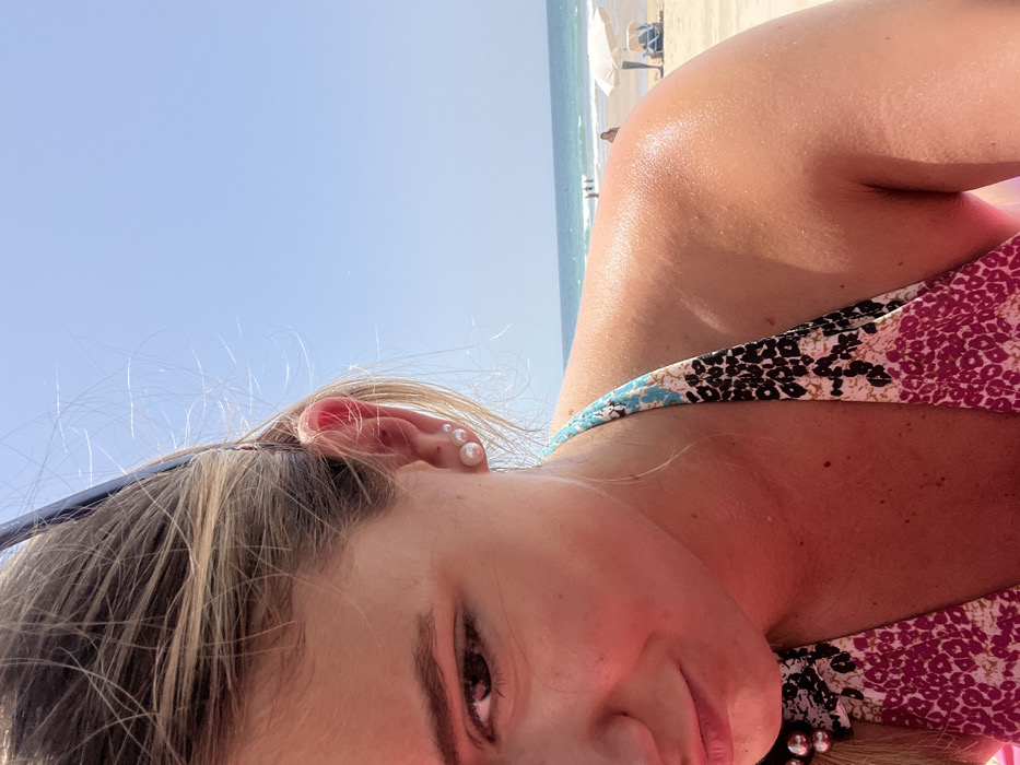 A woman is pictured at a beach, lying on her side. The sky and ocean are visible in the background with a few people and umbrellas. She has blonde hair and is wearing multiple pearl earrings. Her skin appears shiny, as if she's wearing sunscreen or oil. She's wearing a bikini top with a pink and animal print pattern. The image is taken from a close-up, slightly tilted angle.