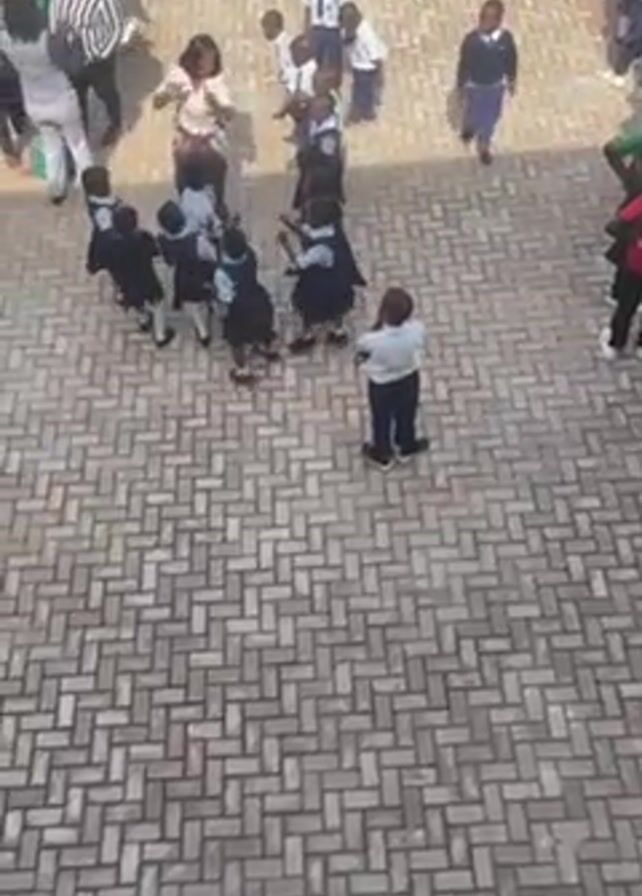 group of young children in school uniforms, dancing in a circle on a brick-paved courtyard. They are surrounded by adults who appear to be teachers or parents, and some older students. Some adults are watching and clapping, while others are walking around. The children are mostly in dark blue or navy uniforms. The scene is captured from an elevated viewpoint, likely from a building overlooking the courtyard. The weather seems sunny and bright.