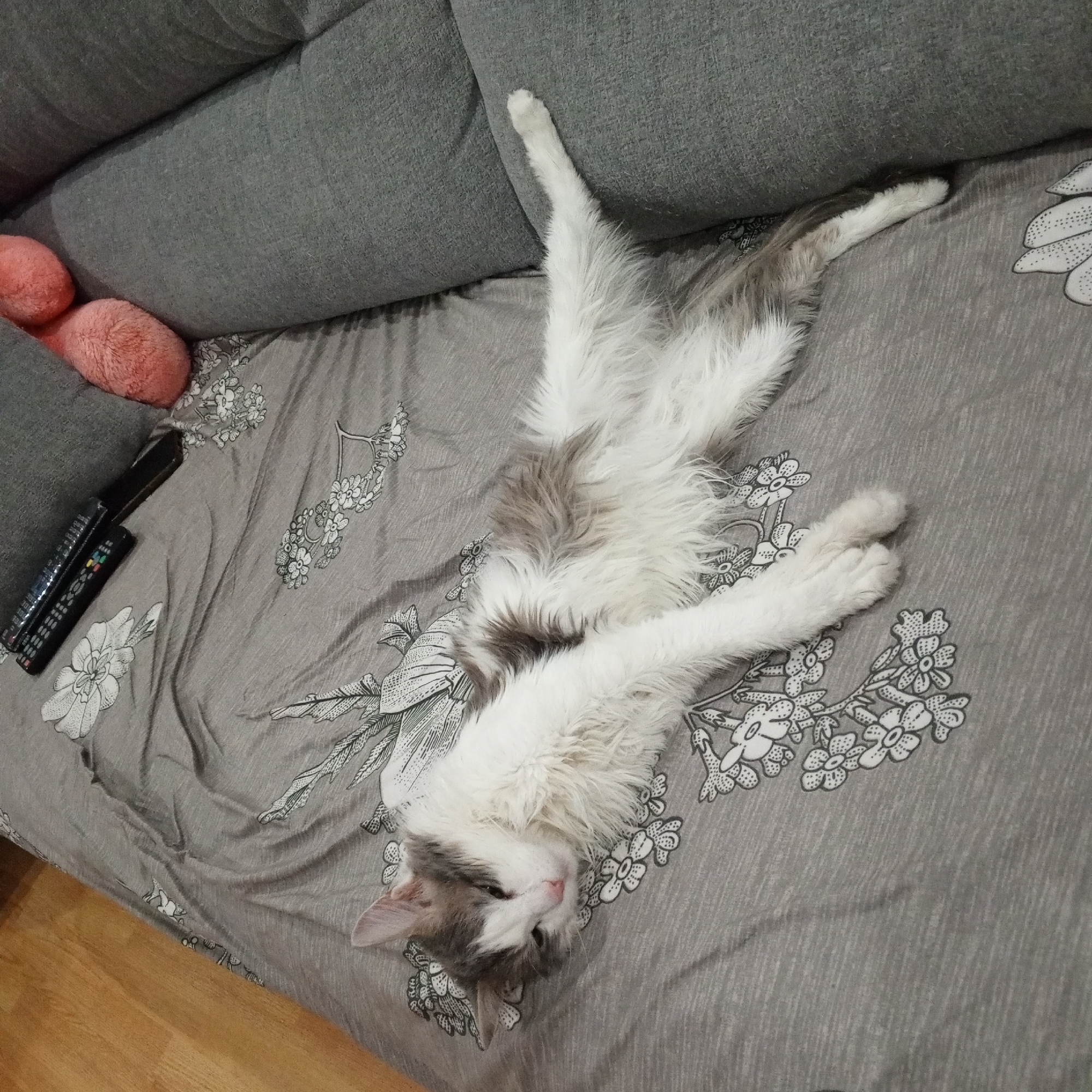A gray and white cat is lying on a gray couch with a floral pattern. The cat is stretched out with its legs extended. There are two pink pom-poms and two remote controls on the couch. The couch is located indoors, likely in a home. The photograph does not provide enough information to determine if the scene is in Gremyachinsk, Russia.