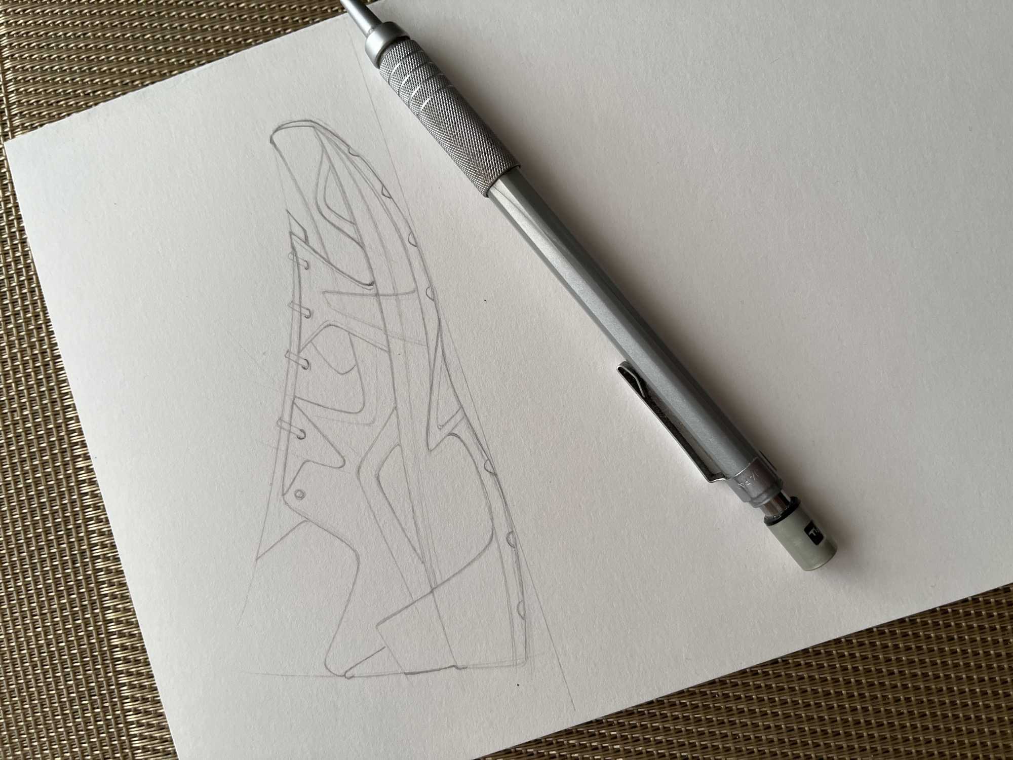 A top-down shot shows a sheet of white paper with a pencil drawing and a mechanical pencil resting on top of it, all sitting on a tan, woven surface. The drawing appears to be a sketch of a shoe, outlined in light pencil strokes. The silver mechanical pencil is positioned diagonally across the upper right corner of the paper. The background is the woven surface, which takes up the lower and left edges of the frame.