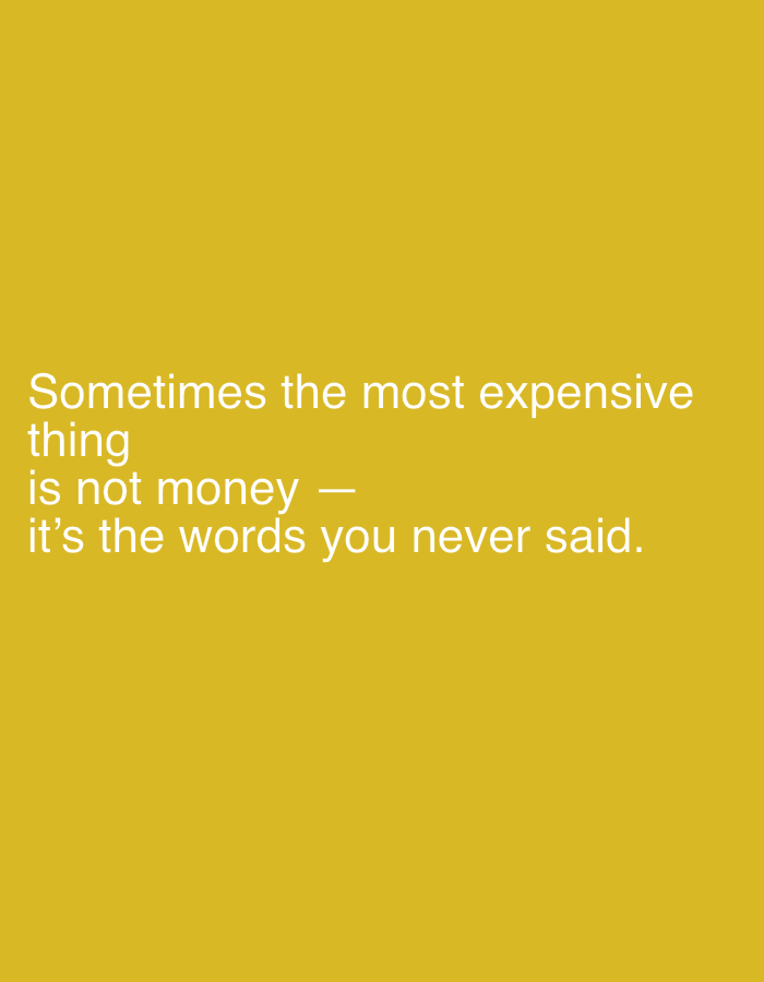 A mustard-yellow background displays a poignant quote. The text states, "Sometimes the most expensive thing is not money – it's the words you never said." The simple font and color palette put emphasis on the message.