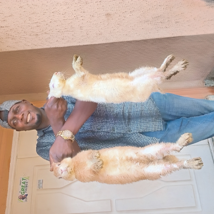 In Narayi, Kaduna, Nigeria, an adult male stands outdoors, smiling directly at the camera while holding two deceased large rodents by their hind legs
