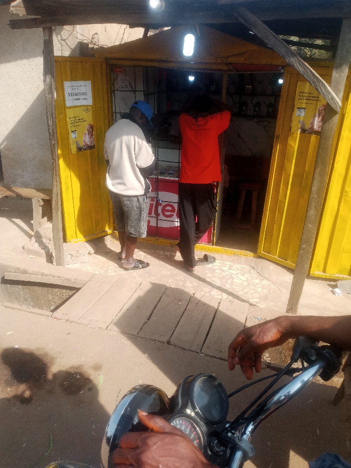 The scene depicts an outdoor commercial establishment in Akwanga, Nigeria, under daylight conditions. In the immediate foreground, the hands of an individual are visible gripping the handlebars of a motorcycle, with a portion of the speedometer and headlight visible, indicating a stationary vantage point. Directly ahead, two adult males are positioned at the entrance of a small retail shop. The shop is characterized by bright yellow corrugated metal security doors; one is fully open to the right, and the other is partially open to the left. A prominent red sign with white "itel" branding is visible at the shop's entrance, suggesting a mobile phone retail or service point. Inside the shop, shelves containing various items, possibly electronics or accessories, are discernible under the illumination of an overhead light bulb. A white paper sign with the number "532401005" printed on it is taped to the left yellow door panel. Another poster or advertisement is affixed to the right yellow door panel. The male on the left is wearing a light-colored long-sleeved top, dark patterned shorts, a blue cap, and sandals. The male on the right is wearing a red long-sleeved top, dark trousers, and dark footwear. Both individuals are facing into the shop, their backs partially or fully to the viewer, indicating they are engaging with the shop's interior or services. The ground directly in front of the shop features a combination of concrete paving and dirt. A shallow drainage channel runs parallel to the shop's front, bridged by several wooden planks to facilitate access. To the left of the shop entrance, a rudimentary wooden bench or stool is present. Shadows are cast by the individuals and structures, consistent with direct sunlight. The building itself appears to be constructed of concrete or stucco, with a weathered, light-colored finish. Overhead, a simple wooden support structure is visible, potentially for an awning or a basic roof extension.