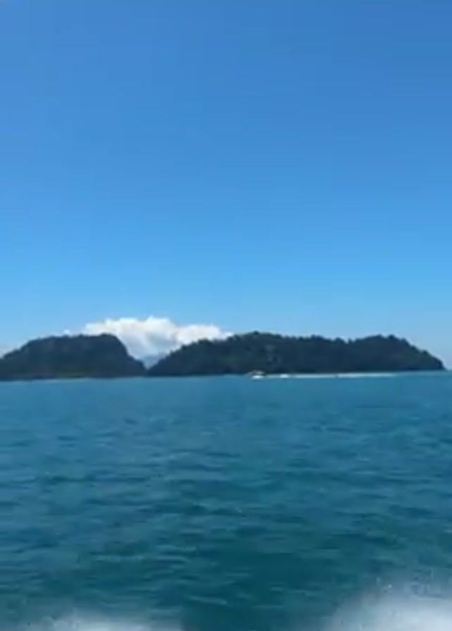 boat traveling across the ocean on a sunny day. In the distance is a forested island. The water is teal and choppy, with white foam visible in the boat's wake. The sky is a clear, bright blue. Another boat is visible in the distance, also moving across the water.
