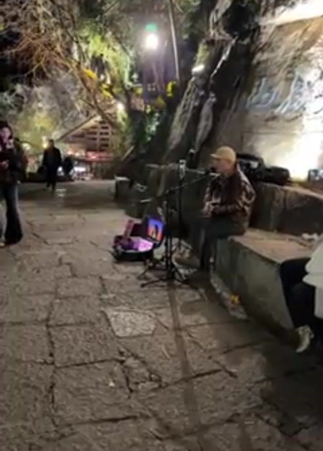 man sitting on a stone ledge outdoors at night, playing a guitar and singing into a microphone. He wears a cap and a camouflage jacket. A small display shows a live image of him as he performs. Two young women dance nearby to the music. The area is paved with stone, and other pedestrians walk by in the background. The scene is lit by streetlights, and there is foliage growing on the rock wall behind the musician.