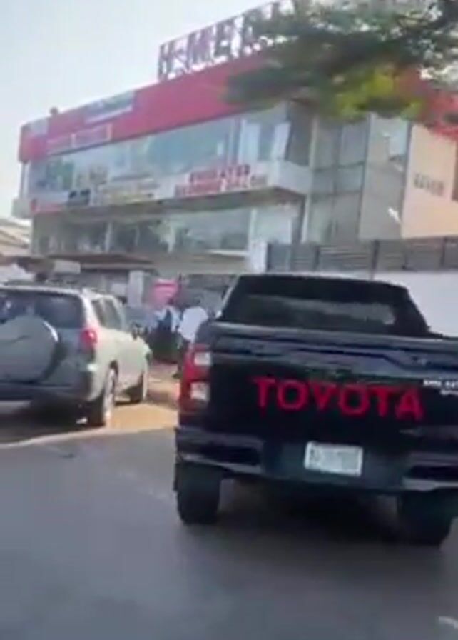 street scene outside a multi-story building, "H-MEDIX", with several businesses advertised on it, including "IQASHER FURNITURE," "Sure Health Lab," "PHOTO STUDIO," and "EMIRATES BARBING SALON." Cars are parked along the street, and people are walking near the building. The camera moves slightly, adjusting the view to capture more of the building and the surrounding street activity. A red and white van is parked near the building with its door open.