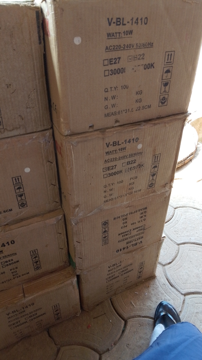 The scene in Shaba, Nigeria, shows a stack of cardboard boxes, likely containing electrical components or light bulbs