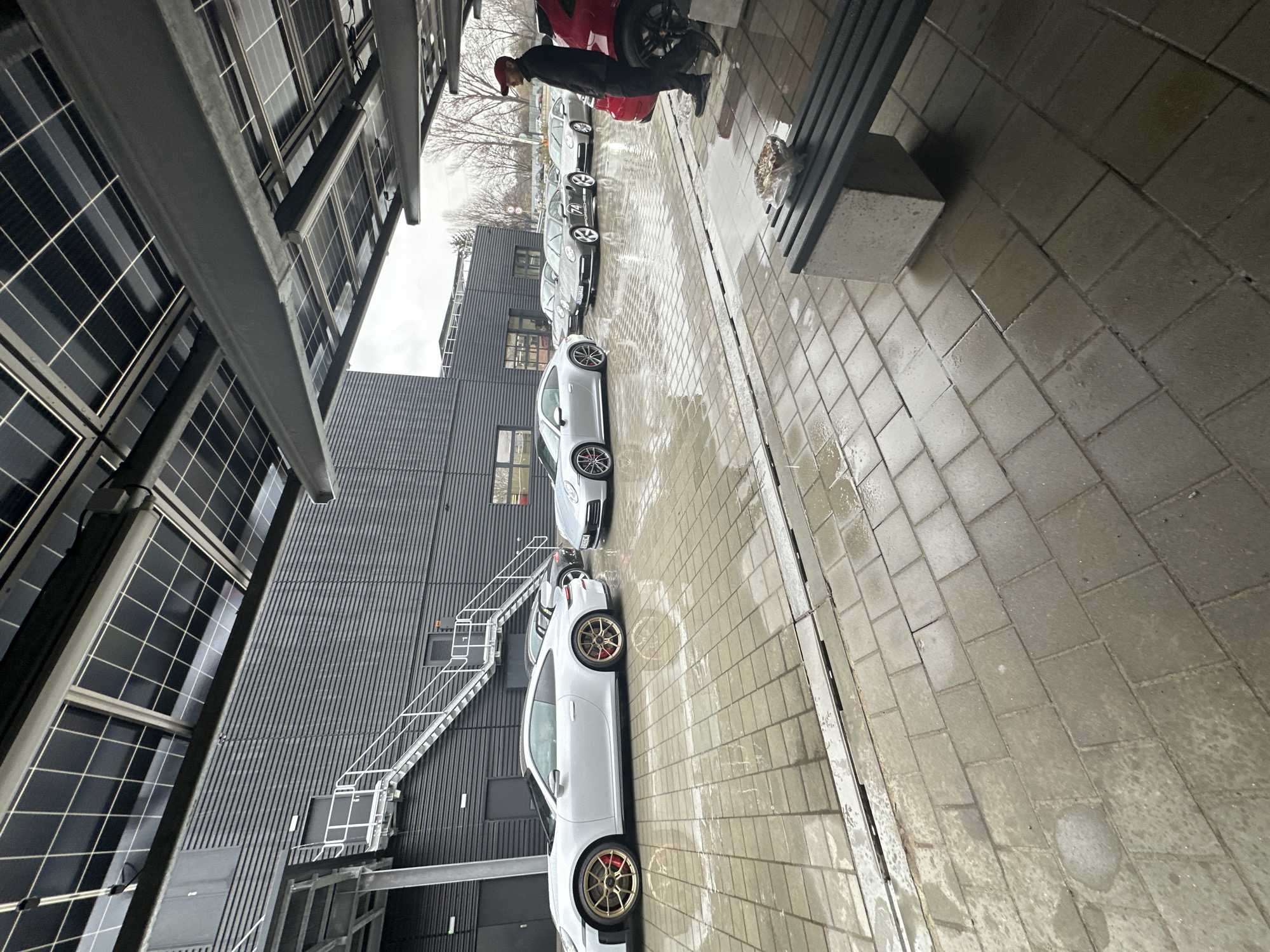 The image depicts an outdoor, partially covered parking area at a modern facility, consistent with the Porsche Center Sofia in Pancharevo, Bulgaria