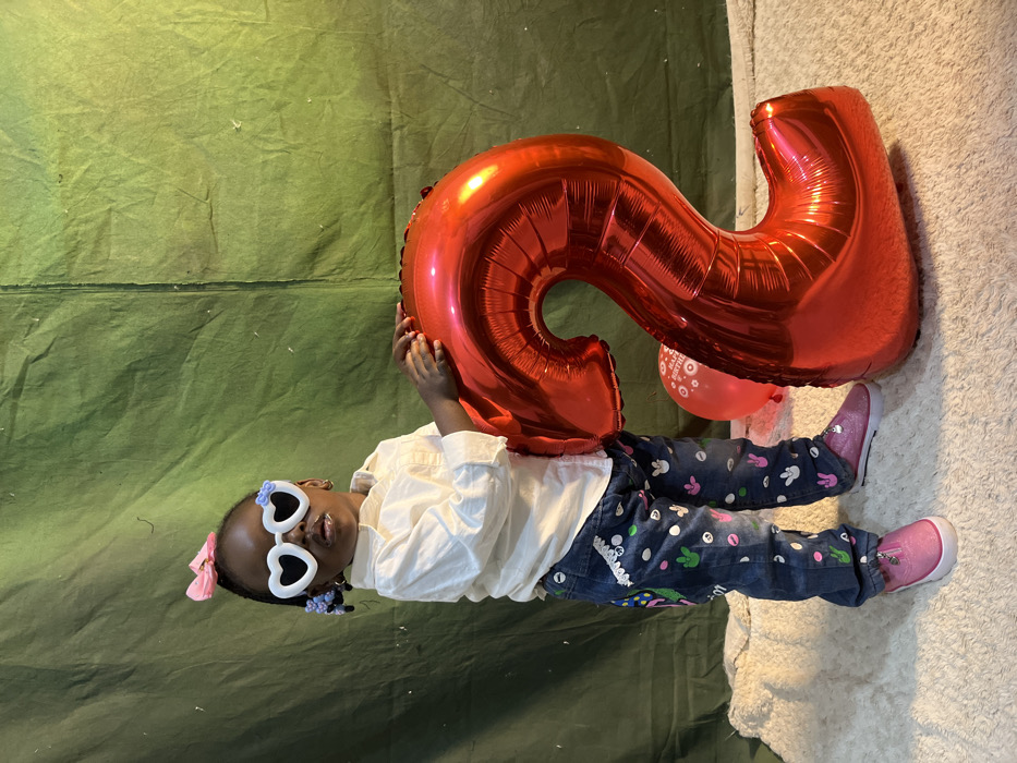 An indoor scene features a young child, likely a toddler, positioned centrally against a crumpled olive-green fabric backdrop. The child, with dark skin, wears a light-colored, long-sleeved collared shirt and dark blue denim jeans embellished with various colored patterns including green cacti and pink rabbits, with a white lace trim on the front right pocket. White heart-shaped sunglasses, adorned with a small light blue bow on the right lens, cover the child's eyes. Hair is styled in small braids with light blue beads, and a pink bow is visible on the top of the head. The child wears pink sparkly slip-on shoes. The child's hands rest on a large, shiny red foil balloon shaped like the number "2". A smaller, round red balloon with "HAPPY BIRTHDAY" text is partially visible behind the number "2" balloon. The floor is covered by a light-colored, textured rug or blanket. The specific location within Jos, Nigeria, is not identifiable from the visual content.