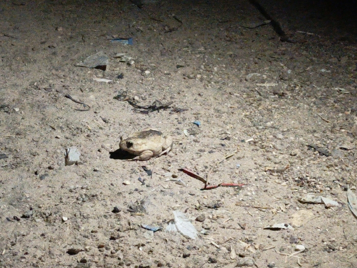A toad sits on a dirt and gravel surface littered with small pieces of trash. The toad, tan and squat, is positioned left of center, casting a small shadow. Debris including bits of plastic and paper are scattered around it. The background is a mix of gravel and dirt, with some indistinct shapes, and a dark shadow towards the top right corner. Lighting appears to be artificial, possibly from a flashlight.