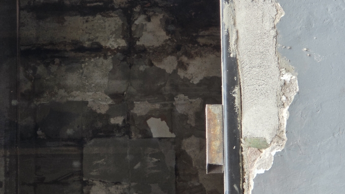 A close-up depicts an interior wall with visible wear and tear. The wall is a patchwork of grey stone blocks, some peeling with age and marked by dark water stains. A vertical black metal frame is present, suggesting a doorway or window, and secured by a rectangular metal bracket. To the right, the frame is bordered by rough, uneven concrete that meets a smooth grey painted wall. The textures are varied, from the coarse stone to the crumbling concrete and sleek paint.