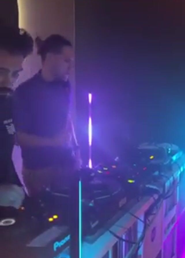 Two men are DJing in a dark room with LED lighting. One man wears a black shirt, headphones, and manipulates the Pioneer equipment. The other man, further back, is wearing a purple shirt and headphones and adjusts the turntable. There are record shelves beneath the equipment, and the ambient lighting is blue and purple.