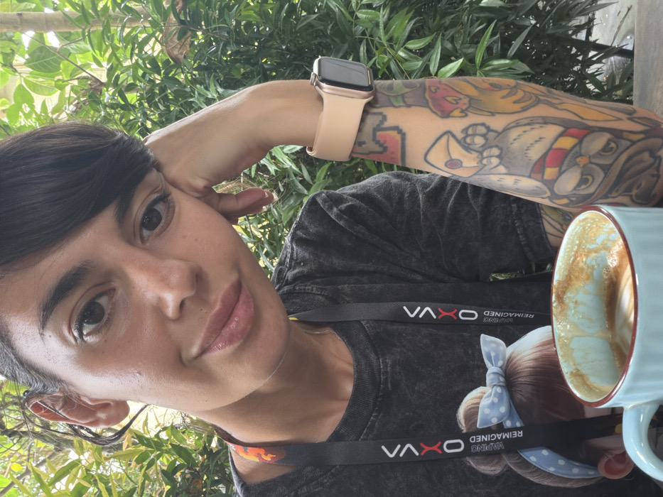 A woman with short, dark hair rests her head on her arm. She has a light skin tone and is wearing a gray shirt and a smartwatch with a light-colored band. Her arm is tattooed with colorful designs. She is wearing a lanyard with the word "VAXO" printed on it. Beside her is a light blue mug with coffee residue inside. Green foliage is visible in the background. She's looking directly at the camera with a soft smile.