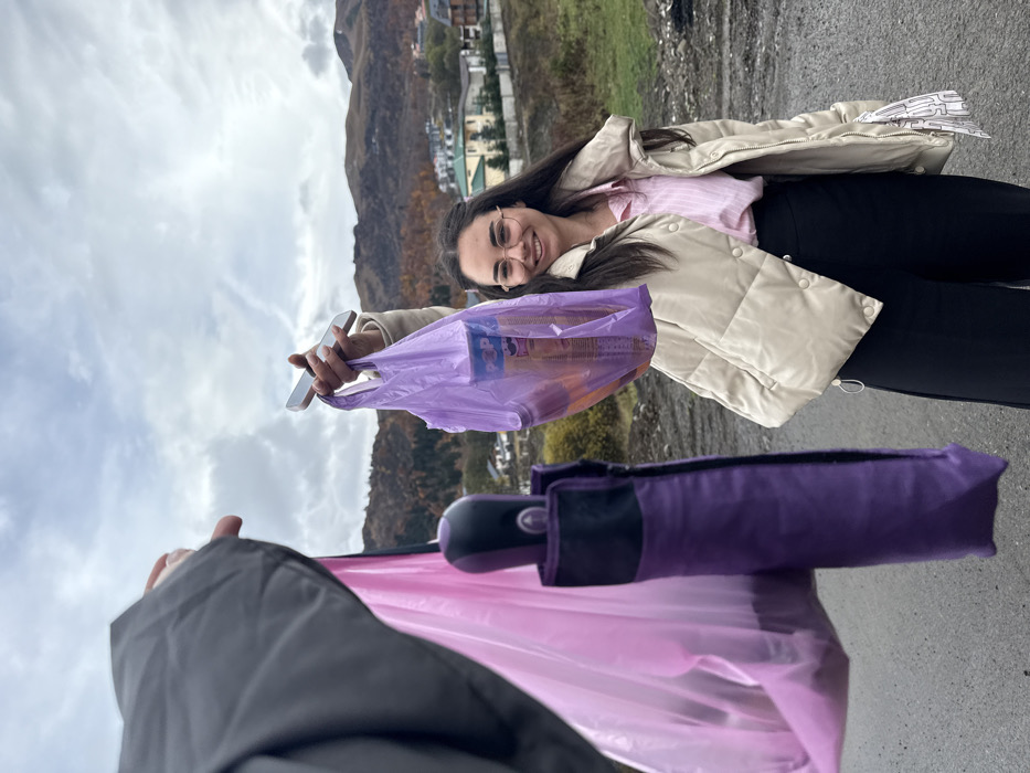The image captures an outdoor scene in Bakuriani, Georgia, under an overcast sky. A female subject occupies the center-right, smiling directly at the camera. She has long, dark hair and wears round eyeglasses, a light pink striped button-down shirt, a beige puffer jacket, and black wide-leg trousers. Her right arm is raised, holding a translucent purple plastic shopping bag containing a cylindrical item labeled "POP" and other indiscernible objects. A light-colored smartphone is held in the same hand, positioned above the bag. To the left, a portion of a second individual's arm, clad in a dark gray sleeve, is visible, holding a translucent pink plastic sheet and a folded, sheathed dark purple umbrella. The immediate foreground consists of dark, unpaved ground. The background reveals a sloping landscape with multiple residential buildings featuring various roof colors (green, white, brown) interspersed among trees exhibiting autumn foliage. Distant mountains or hills are visible beyond the residential area, extending to the horizon beneath the cloudy sky.
