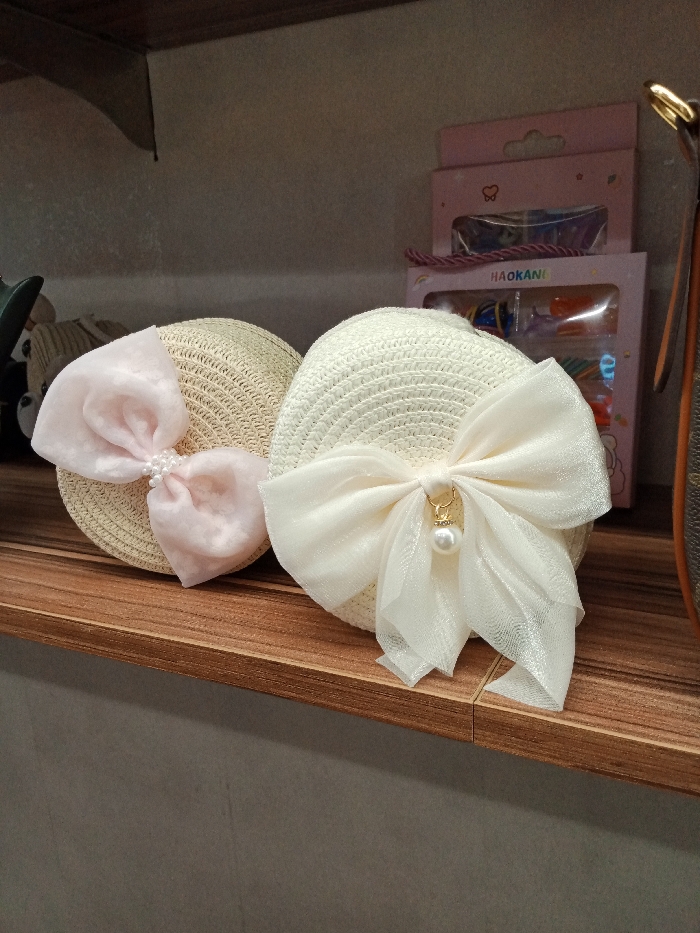 The image displays two decorative, circular woven straw items resting on a brown wooden shelf in an indoor setting, possibly a retail display or personal storage area in the city of Unknown, Unknown. The item on the left is a pale beige straw construction, approximately circular, featuring a prominent light pink fabric bow adorned with a cluster of small white spherical beads at its center. The item on the right is an off-white straw construction with a large, sheer off-white fabric bow. A small gold-colored charm holding a single white spherical bead is attached to the center of this bow. The wooden shelf exhibits a visible wood grain. In the background, a plain gray-toned wall is present, with a darker brown shelf running horizontally above it. To the immediate right of the off-white item, a brown object with a dark brown monogram pattern, consistent with a leather bag, is partially visible. Further back, above the right item, several pink packaged items are stacked, one clearly labeled "HAOKANG." No individuals are present, and no actions or interactions are depicted; the objects are static.