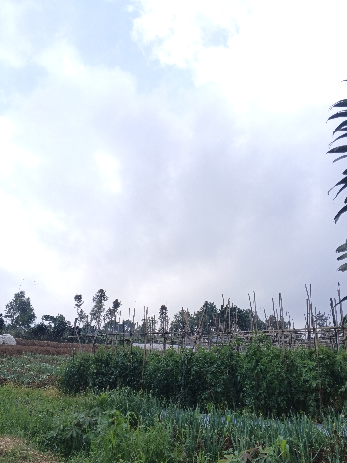 A rural landscape presents a cultivated field beneath an overcast sky. Rows of crops, including tomatoes supported by wooden stakes, fill the foreground, transitioning into patches of diverse vegetation. A simple bamboo fence spans the field. In the distance, a line of trees and foliage blurs into the horizon, while a few clouds drift above.