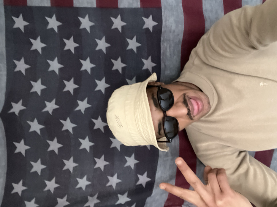 An individual is depicted in a frontal, close-up shot, presumably indoors, in Tanger, Morocco. The subject is an adult male with a mustache, wearing dark sunglasses, a light-colored bucket hat with an emblem on the front, and a light-colored long-sleeved turtleneck shirt. He is making a "V" sign with his left hand (viewer's right) and has his tongue slightly extended from his mouth. The background consists of a draped American flag, showing multiple white stars on a blue field, and a portion of red and white stripes on the right side.