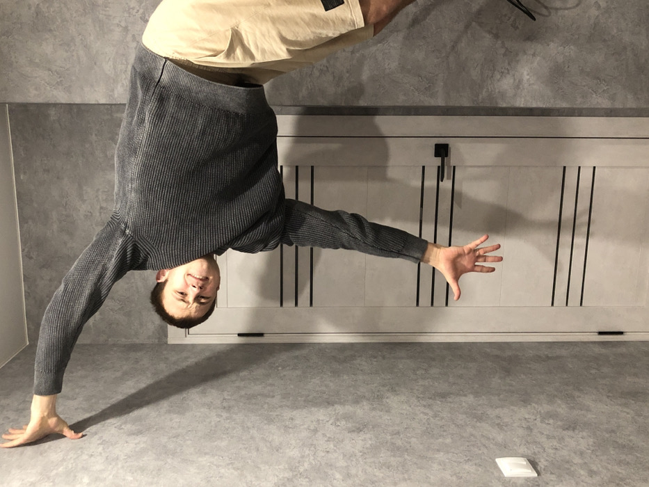A man in a gray sweater and beige shorts is doing a handstand. His head is close to a light gray wall with vertical black lines. His left arm is extended to the side, while his right arm supports his weight. The floor is a similar light gray color. A small, white, rectangular object is visible on the floor. The background consists of a textured gray wall above a white paneled structure with black handles. The image is oriented upside down.