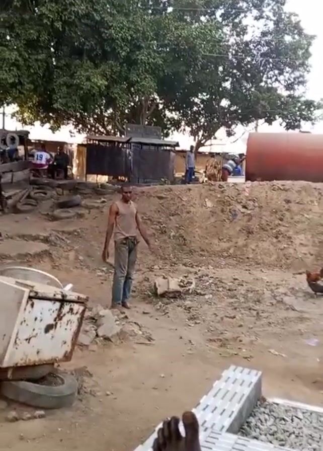 dirt-filled area with a man standing in the middle of the scene. He is wearing a tank top and pants. In the background, there are a few people sitting and standing near a shack and a large red tank. There is a rusted wheelbarrow to the left. In the foreground, there is a bare foot resting on a surface tiled with white and gray stones.